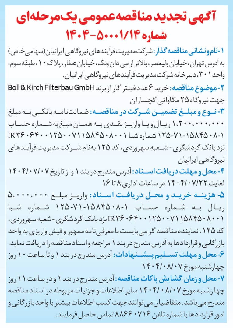 مناقصه خرید ۶ عدد فیلتر گاز از بـرنـد Boll & Kirch Filterbau GmbH جهت نیروگاه ۲۵ مگاواتی گچساران