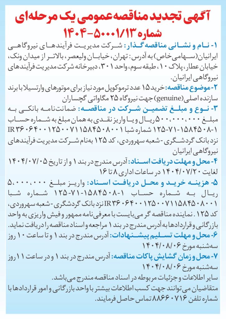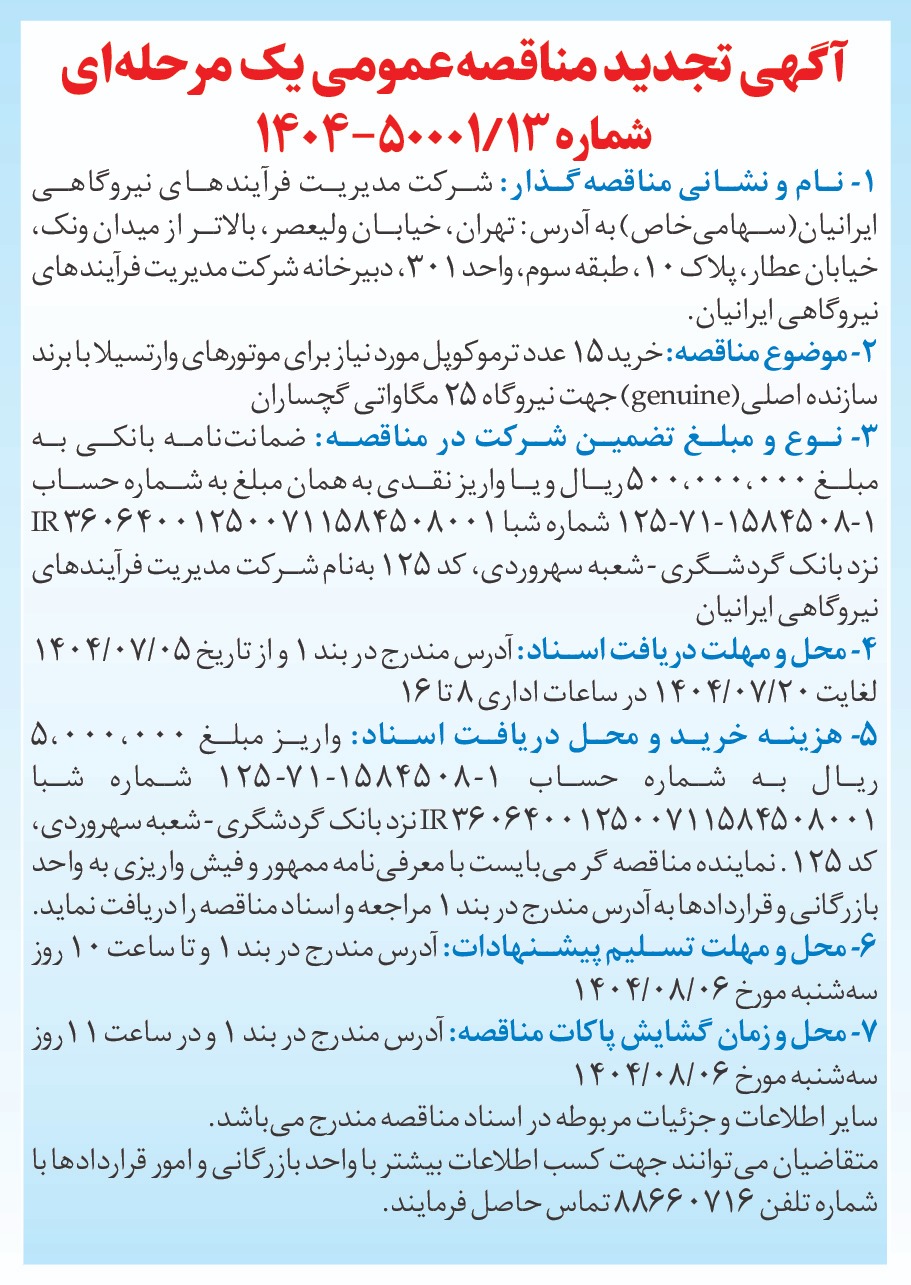 مناقصه گذار: مدیریت فرآیندهای نیروگاهی ایرانیان ( مفنا )
