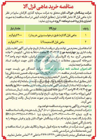 مناقصه خرید ماهی قزل آلا ۱-ماهی قزل الا تازه طبق درخواست وزنی خریدار ۴۰۰۰ کیلوگرم ۲-ماهی قزل الامنجمد ۱۹