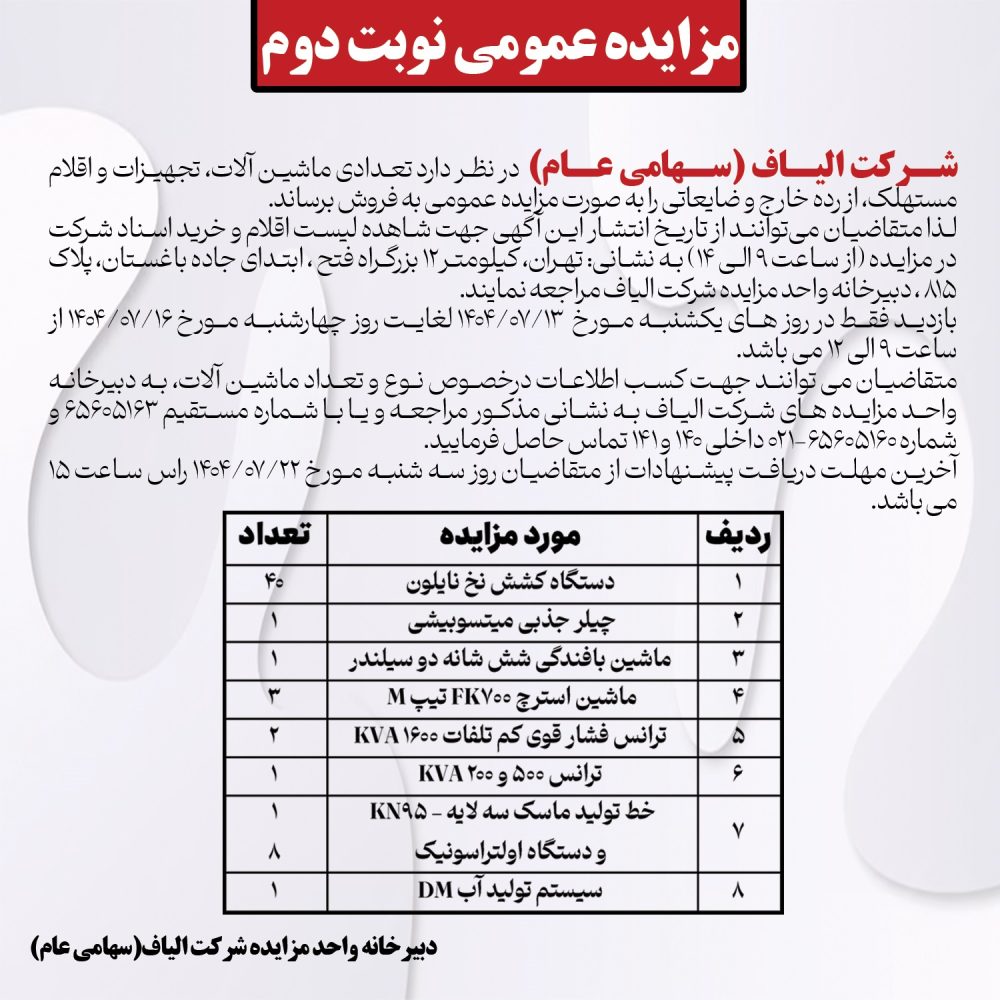 مزایده تعدادی ماشین آلات تجهیزات و اقلام مستهلک از رده خارج و ضایعاتی. ۱- دستگاه کشش نخ نایلون ۲- چیلر جذبی میتسوبیشی ۳- ماشین بافندگی شش شانه دو سیلندر ۴- ماشین استرچ FK۷۰۰ تیپ M 5- ترانس فشار قوی کم تلفات ۱۶۰۰ ۸/KV 6- ترانس ۵۰۰ و ۲۰۰ KVA 7-خط تولید ماسک سه لایه – KN۹۵ و دستگاه اولتراسونیک ۸- سیستم تولید آب DM