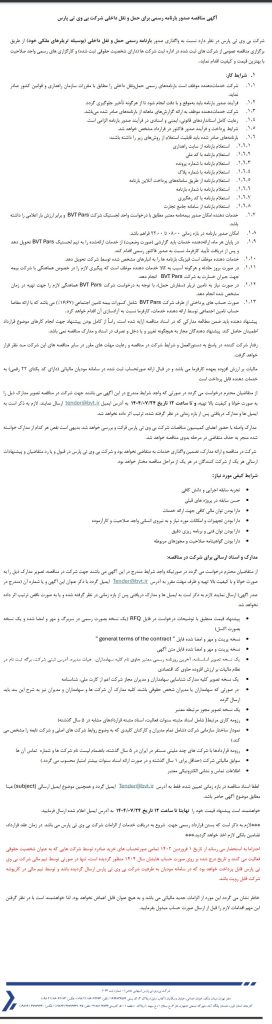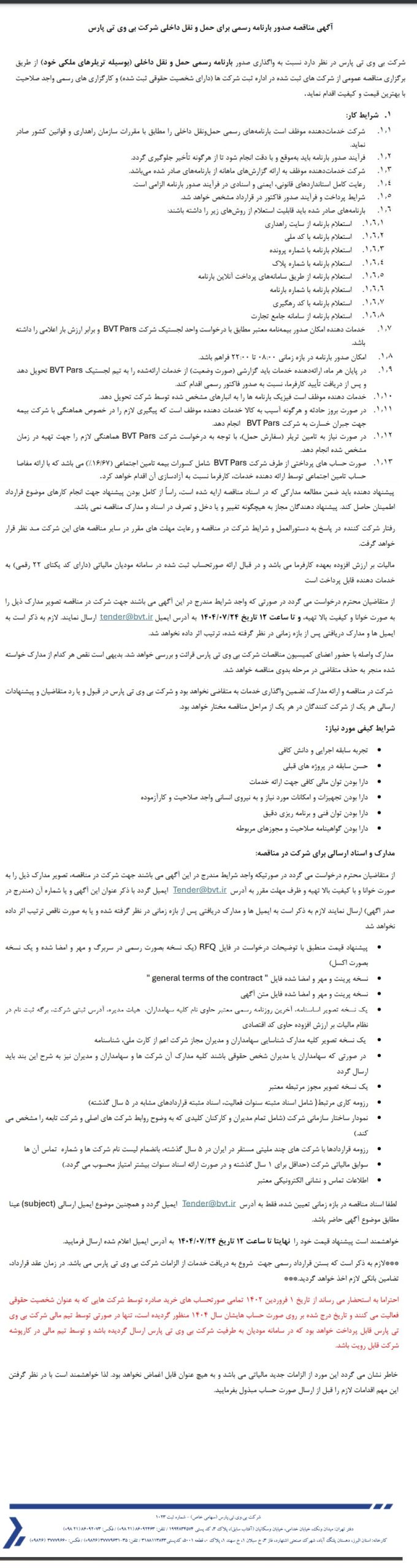 شرکت بی وی تی پارس در نظر دارد نسبت به واگذاری صدور بارنامه رسمی حمل و نقل داخلی (بوسیله تریلرهای ملکی خود) از طریق برگزاری مناقصه عمومی از شرکت های ثبت شده در اداره ثبت شرکت ها (دارای شخصیت حقوقی ثبت شده) و کارگزاری های رسمی واجد صلاحیت با بهترین قیمت و کیفیت اقدام نماید.