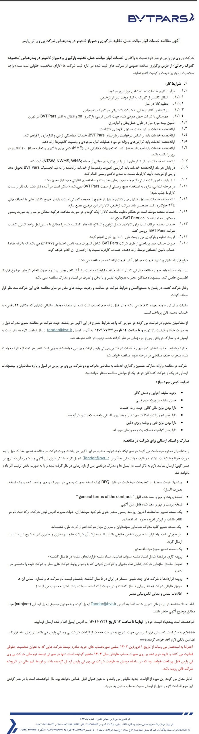 شرکت بی وی تی پارس در نظر دارد نسبت به واگذاری خدمات انبار موقت، حمل، تخلیه، بارگیری و دموراژ کانتینر در بندرعباس (محدوده گمرک رجائی) از طریق برگزاری مناقصه عمومی از شرکت های ثبت شده در اداره ثبت شرکت ها (دارای شخصیت حقوقی ثبت شده) واجد صلاحیت با بهترین قیمت و کیفیت اقدام نماید.