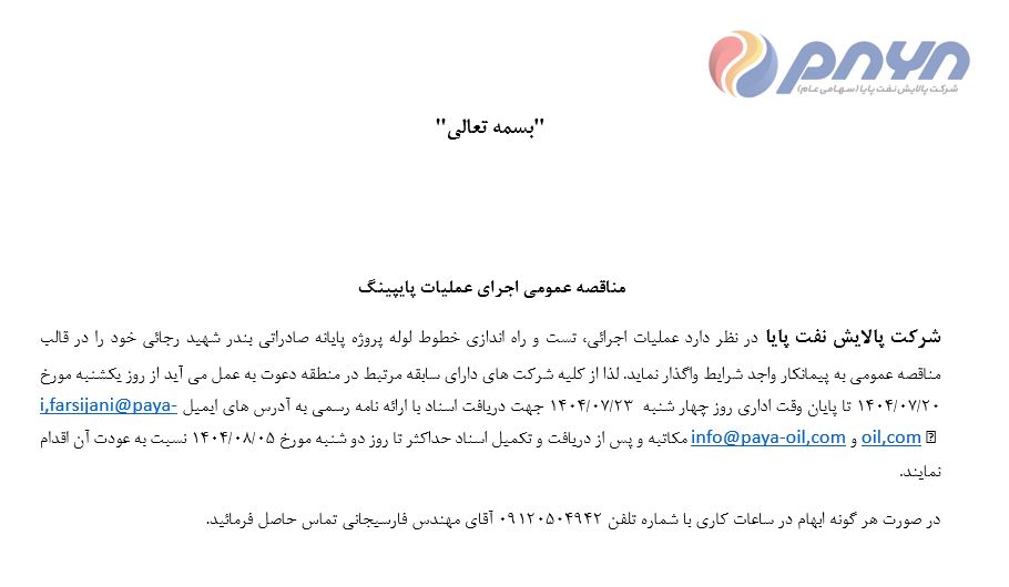 شرکت پالایش نفت پایا در نظر دارد عملیات اجرائی، تست و راه اندازی خطوط لوله پروژه پایانه صادراتی بندر شهید رجائی خود را در قالب مناقصه عمومی به پیمانکار واجد شرایط واگذار نماید.