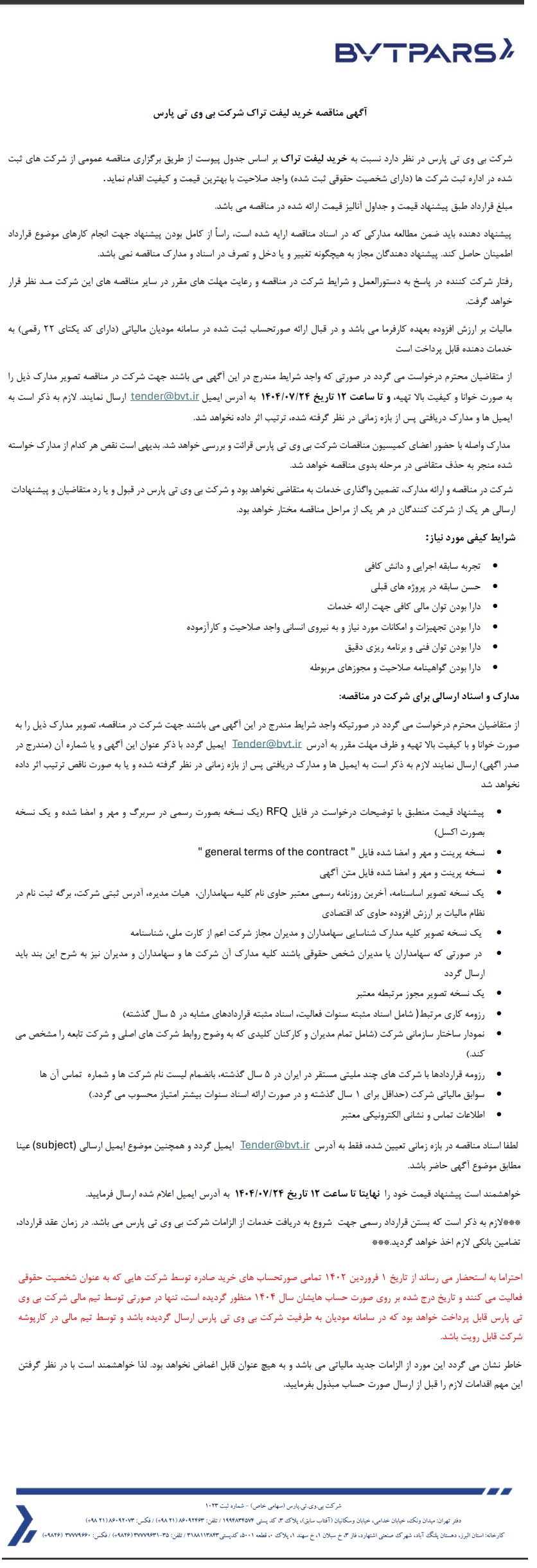 شرکت بی وی تی پارس در نظر دارد نسبت به خرید لیفت تراک بر اساس جدول پیوست از طریق برگزاری مناقصه عمومی از شرکت های ثبت شده در اداره ثبت شرکت ها (دارای شخصیت حقوقی ثبت شده) واجد صلاحیت با بهترین قیمت و کیفیت اقدام نماید.