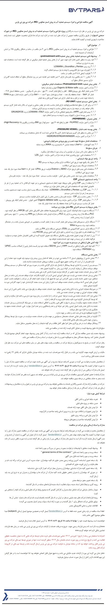 شرکت بی وی تی پارس در نظر دارد نسبت به واگذاری پروژه طراحی و اجراء سیستم تصفیه اب به روش اسمز معکوس (RO ) در شهرک صنعتی اشتهارد از طریق برگزاری مناقصه عمومی از شرکت های ثبت شده در اداره ثبت شرکت ها (دارای شخصیت حقوقی ثبت شده) واجد صلاحیت با بهترین قیمت و کیفیت اقدام نماید.