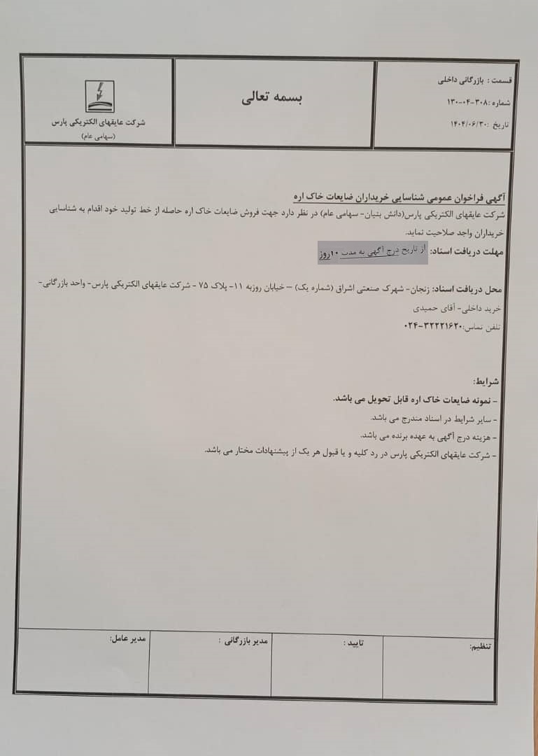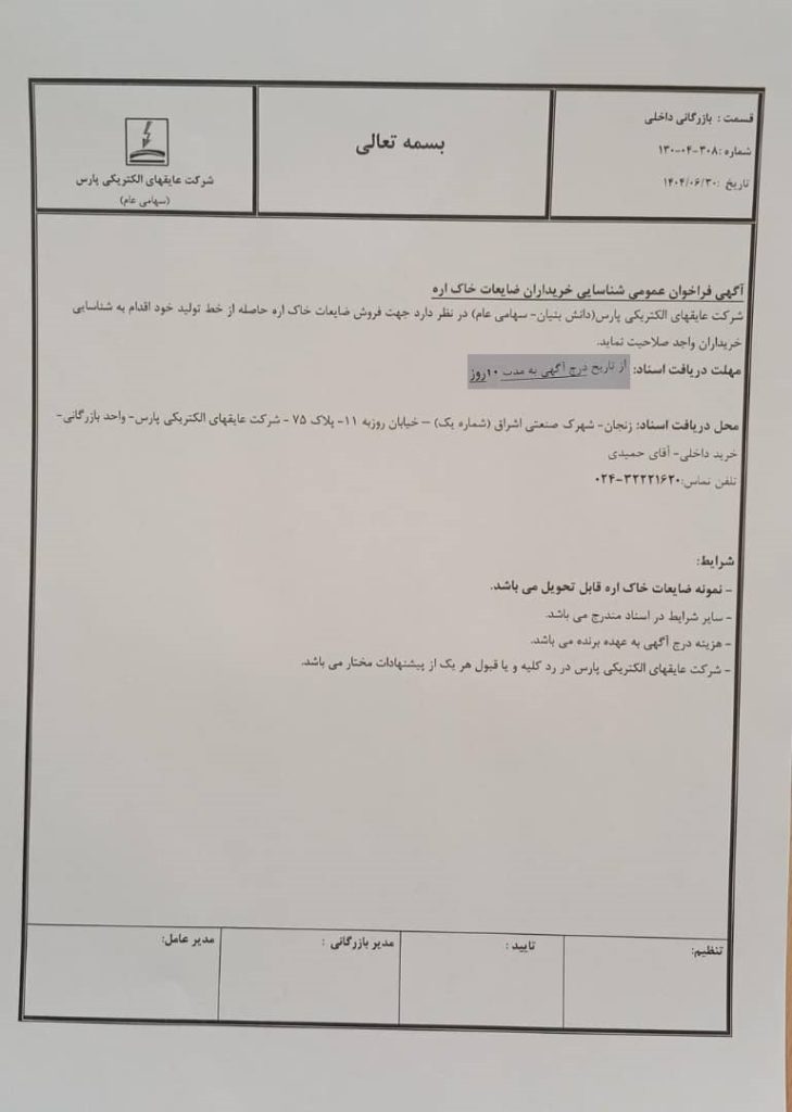 مزایده گذار: عایقهای الکتریکی پارس