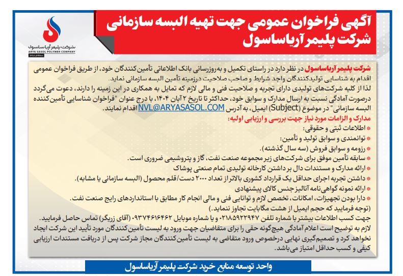 مناقصه جهت تهیه البسه سازمانی شرکت پلیمر آریا ساسول