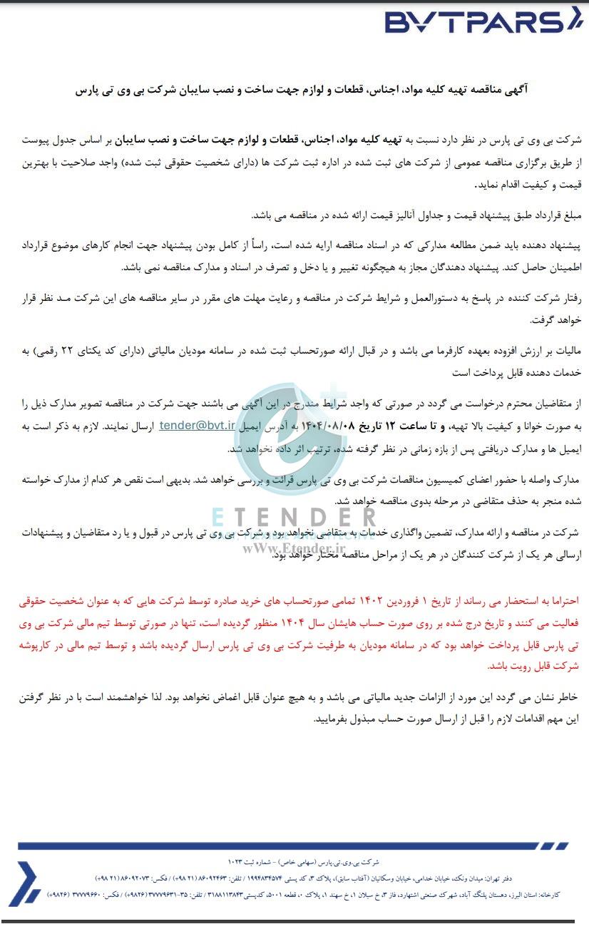 شرکت بی وی تی پارس در نظر دارد نسبت به تهیه کلیه مواد، اجناس، قطعات و لوازم جهت ساخت و نصب سایبان بر اساس جدول پیوست از طریق برگزاری مناقصه عمومی از شرکت های ثبت شده در اداره ثبت شرکت ها (دارای شخصیت حقوقی ثبت شده) واجد صلاحیت با بهترین قیمت و کیفیت اقدام نماید.