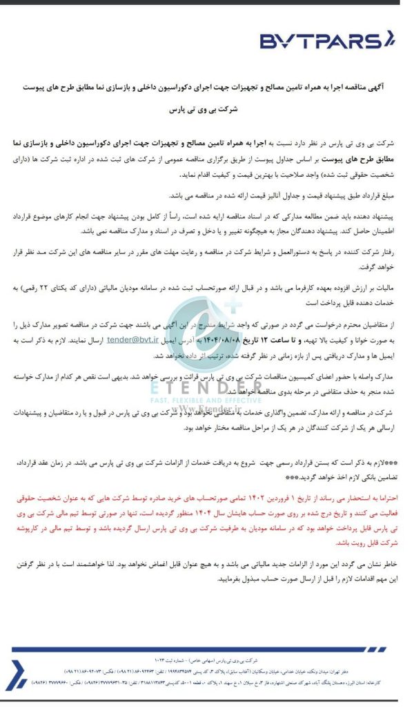 شرکت بی وی تی پارس در نظر دارد نسبت به اجرا به همراه تامین مصالح و تجهیزات جهت اجرای دکوراسیون داخلی و بازسازی نما مطابق طرح های پیوست بر اساس جداول پیوست از طریق برگزاری مناقصه عمومی از شرکت های ثبت شده در اداره ثبت شرکت ها (دارای شخصیت حقوقی ثبت شده) واجد صلاحیت با بهترین قیمت و کیفیت اقدام نماید.