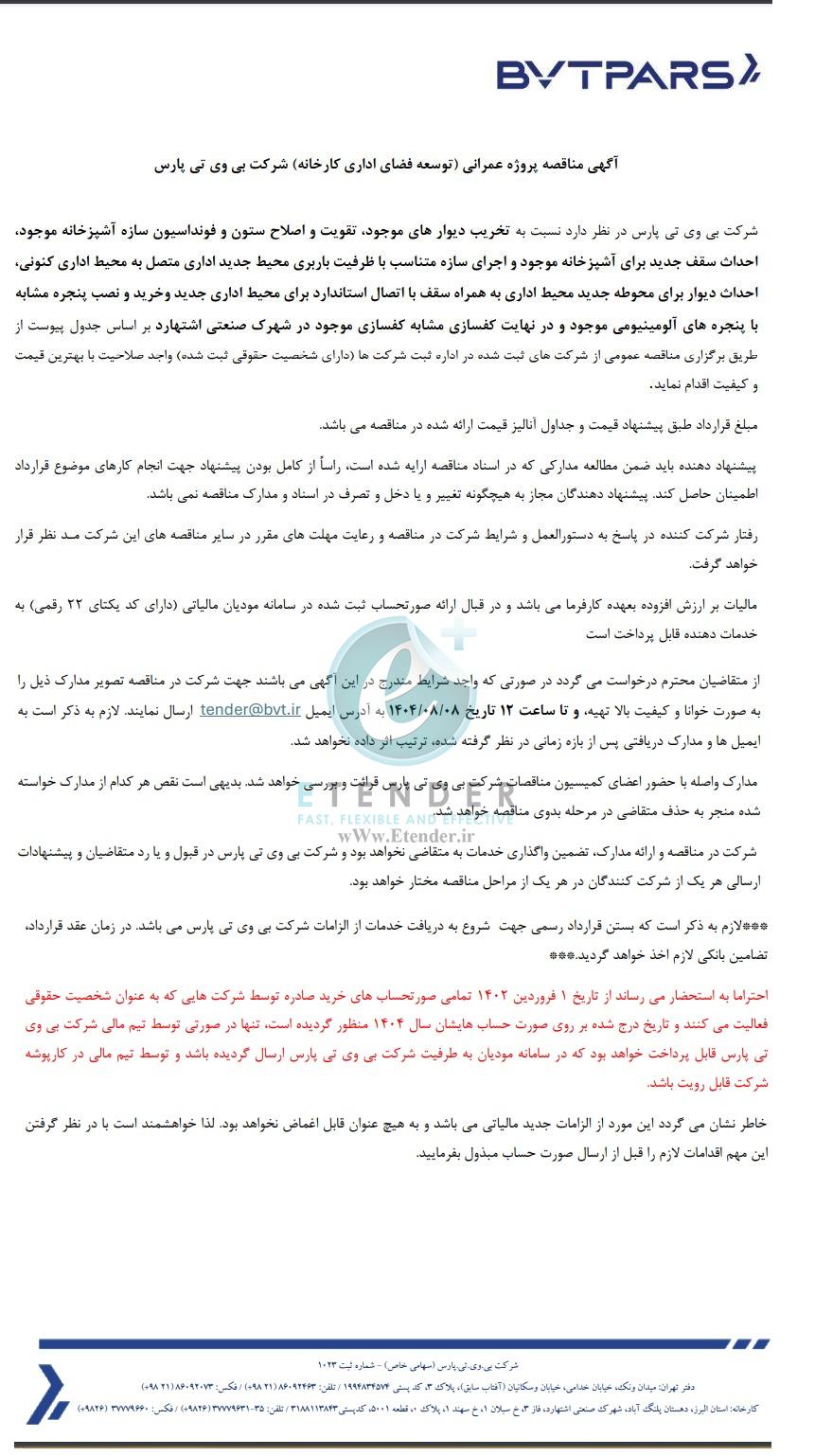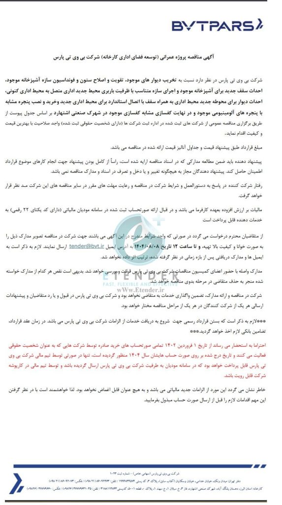 شرکت بی وی تی پارس در نظر دارد نسبت به تخریب دیوارها ی موجود، تقویت و اصلاح ستون و فونداسیون سازه آشپزخانه موجود، احداث سقف جدید برای آشپزخانه موجود و اجرای سازه متناسب با ظرفیت باربری محیط جدید اداری متصل به محیط اداری کنونی، احداث دیوار برای محوطه جدید محیط اداری به همراه سقف با اتصال استاندارد برای محیط اداری جدید وخرید و نصب پنجره مشابه با پنجره ها ی آلومینیومی موجود و در نهایت کفسازی مشابه کفسازی موجود در شهرک صنعتی اشتهارد بر اساس جدول پیوست از طریق برگزاری مناقصه عمومی از شرکت های ثبت شده در اداره ثبت شرکت ها (دارای شخصیت حقوقی ثبت شده) واجد صلاحیت با بهترین قیمت و کیفیت اقدام نماید.