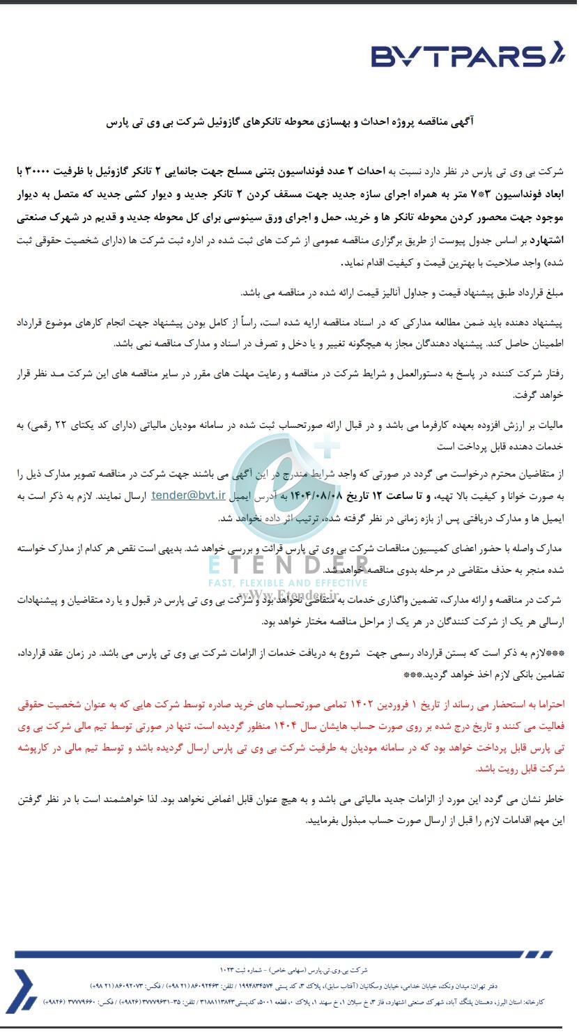 شرکت بی وی تی پارس در نظر دارد نسبت به احداث ۲ عدد فونداسیون بتنی مسلح جهت جانمایی ۲ تانکر گازوئیل با ظرفیت ۳۰۰۰۰ با ابعاد فونداسیون ۳*۷ متر به همراه اجرای سازه جدید جهت مسقف کردن ۲ تانکر جدید و دیوارکشی جدید که متصل به دیوار موجود جهت محصور کردن محوطه تانکرها و خرید، حمل و اجرای ورق سینوسی برای کل محوطه جدید و قدیم در شهرک صنعتی اشتهارد بر اساس جدول پیوست از طریق برگزاری مناقصه عمومی از شرکت های ثبت شده در اداره ثبت شرکت ها (دارای شخصیت حقوقی ثبت شده) واجد صلاحیت با بهترین قیمت و کیفیت اقدام نماید.