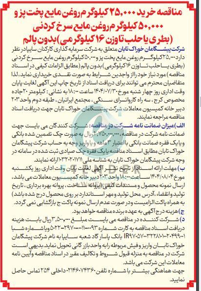 مناقصه خرید ۲۵,۰۰۰ کیلوگرم روغن مایع پخت پزو ۵۰,۰۰۰ کیلوگرم روغن مایع سرخ کردنی