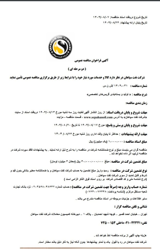 مناقصه تولید و بسته بندی گریس های تخصصی شرکت نفت سپاهان