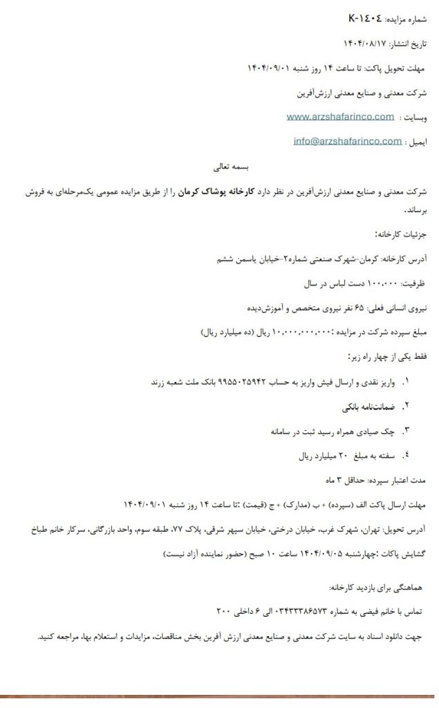 شرکت معدنی و صنایع معدنی ارزش آفرین در نظر دارد کارخانه پوشاک کرمان را از طریق مزایده عمومی یک مرحله ای به فروش برساند.
