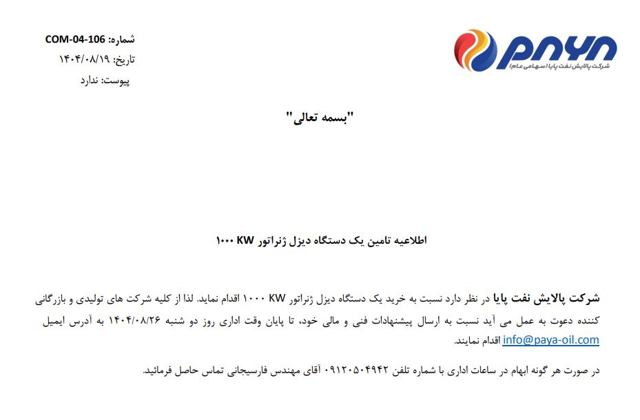 شرکت پالایش نفت پایا در نظر دارد نسبت به خرید یک دستگاه دیزل ژنراتور KW 1000 اقدام نماید.