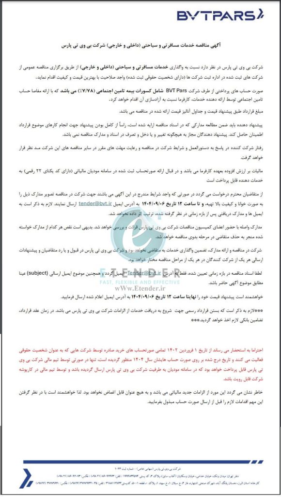 مناقصه خدمات مسافرتی و سیاحتی (داخلی و خارجی) شرکت بی وی تی پارس