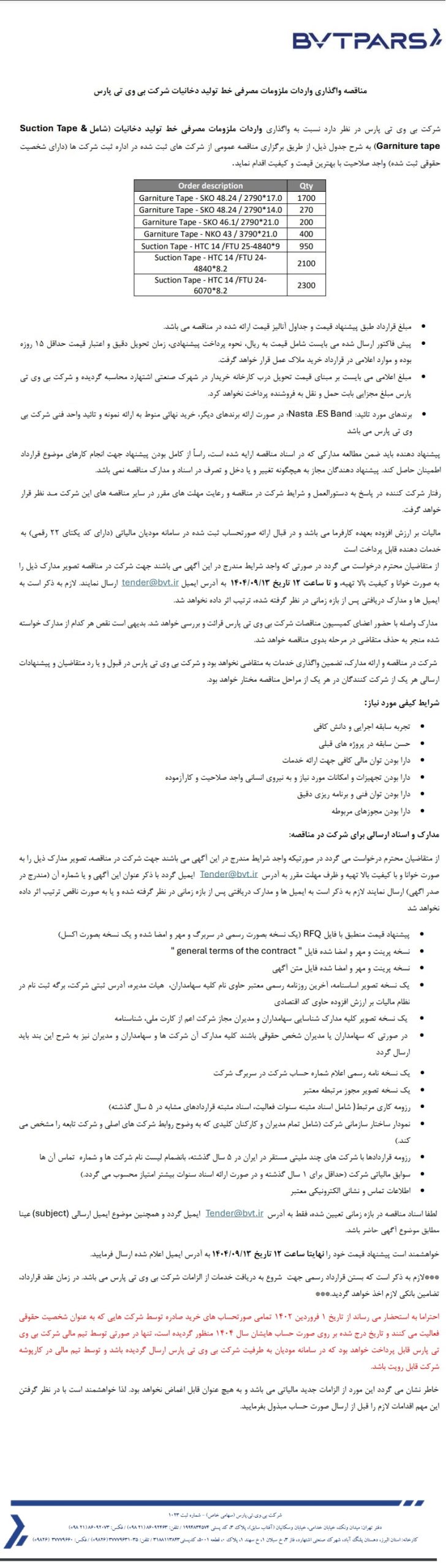 شرکت بی وی تی پارس در نظر دارد نسبت به واگذاری واردات ملزومات مصرفی خط تولید دخانیات (شامل & Tape Suction tape Garniture) به شرح جدول ذیل، از طریق برگزاری مناقصه عمومی از شرکت های ثبت شده در اداره ثبت شرکت ها (دارای شخصیت حقوقی ثبت شده) واجد صلاحیت با بهترین قیمت و کیفیت اقدام نماید.