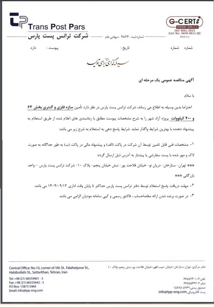 مناقصه گذار: ترانس پست پارس