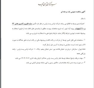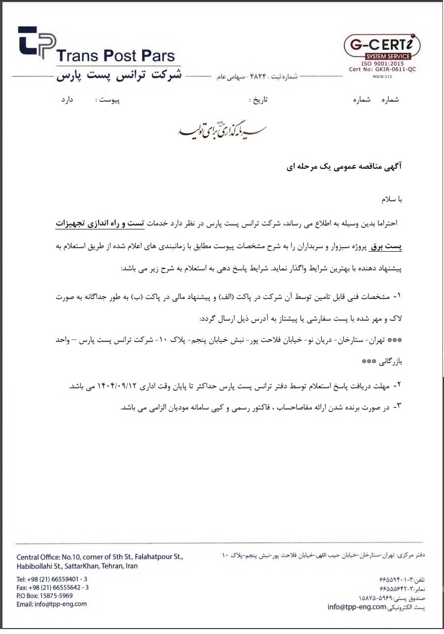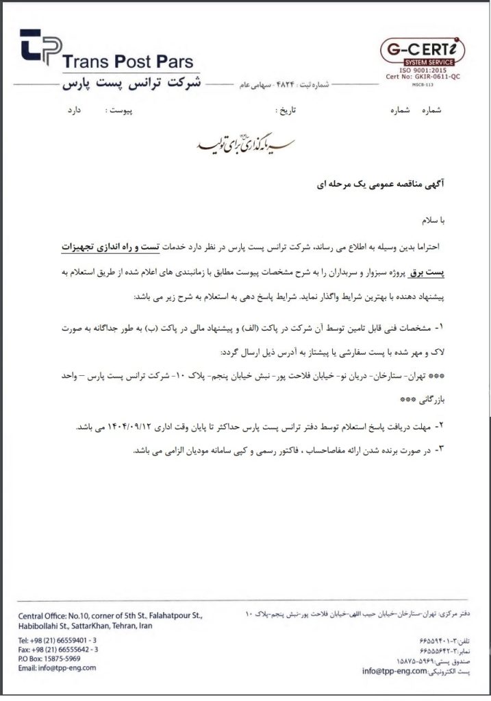 مناقصه خدمات تست و راه اندازی تجهیزات پست برق شرکت ترانس پست پارس