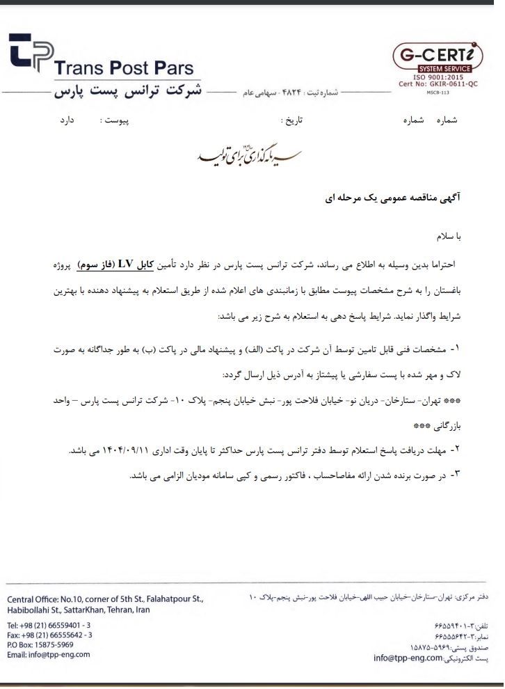 مناقصه تأمین کابل LV (فاز سوم) پروژه باغستان شرکت ترانس پست پارس