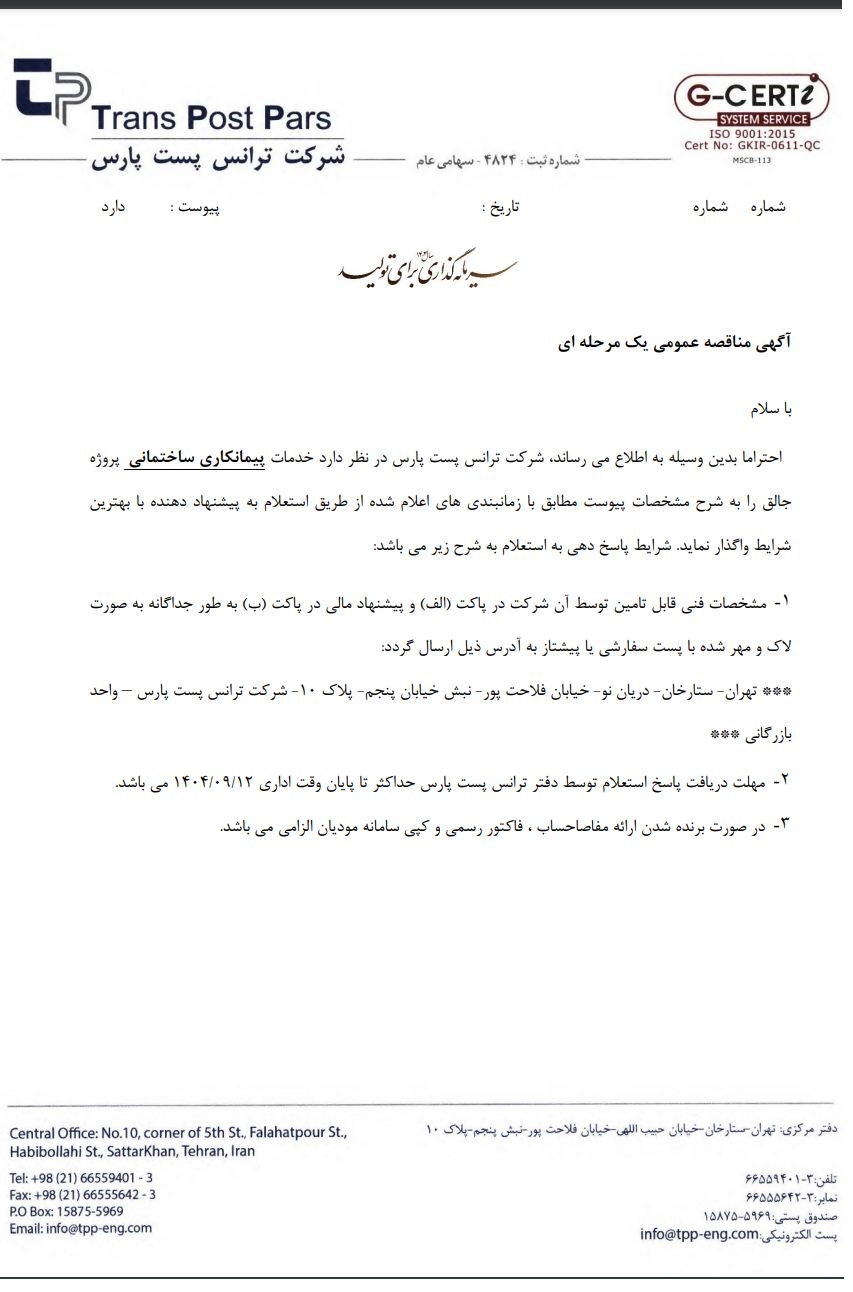 مهلت دریافت اسناد: ۱۴۰۴-۰۹-۱۲