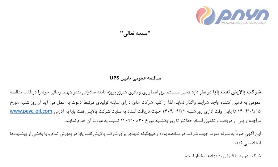 شرکت پالایش نفت پایا در نظر دارد تامین سیستم برق اضطراری و باتری شارژر پروژه پایانه صادراتی بندر شهید رجائی خود را در قالب مناقصه عمومی به تامین کننده واجد شرایط واگذار نماید