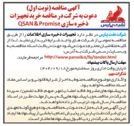 مناقصه خرید تجهیزات ذخیره سازی اطلاعات شرکت نفت پارس