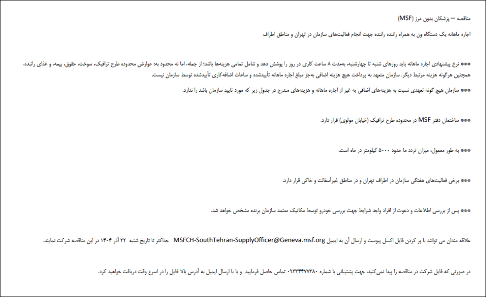 مناقصه اجاره ماهانه یک دستگاه ون به همراه راننده شرکت پزشکان بدون مرز MSF سوئیس