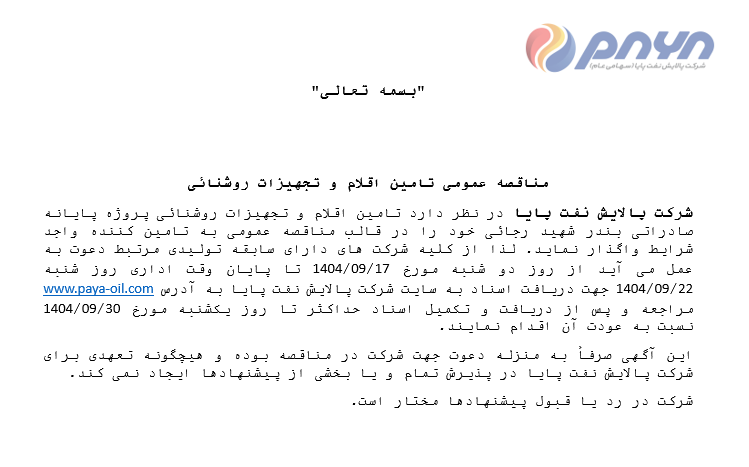 شرکت پالایش نفت پایا در نظر دارد تامین اقلام و تجهیزات روشنائی پروژه پایانه صادراتی بندر شهید رجائی خود را در قالب مناقصه عمومی به تامین کننده واجد شرایط واگذار نماید.