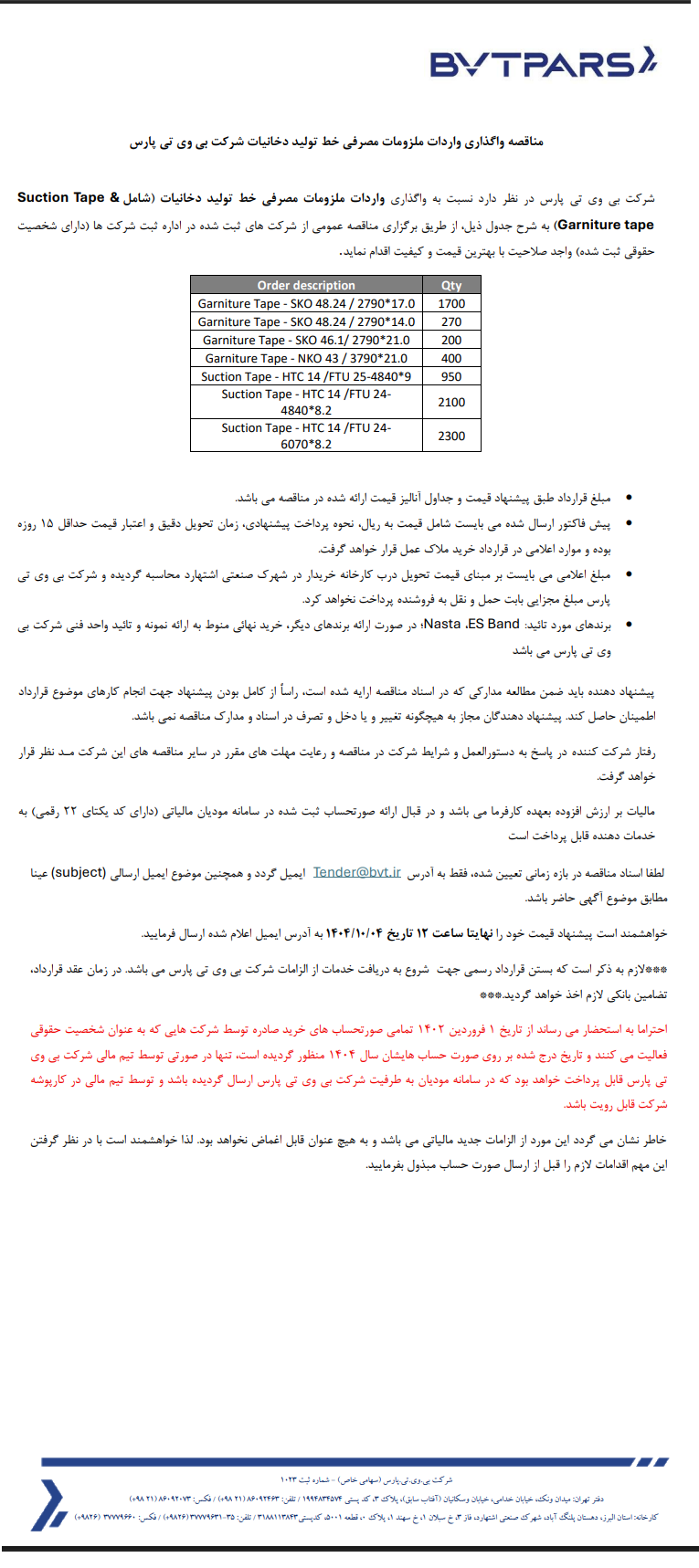 شرکت بی وی تی پارس در نظر دارد نسبت به واگذاری واردات ملزومات مصرفی خط تولید دخانیات (شامل & Tape Suction tape Garniture )،از طریق برگزاری مناقصه عمومی با بهترین قیمت و کیفیت اقدام نماید