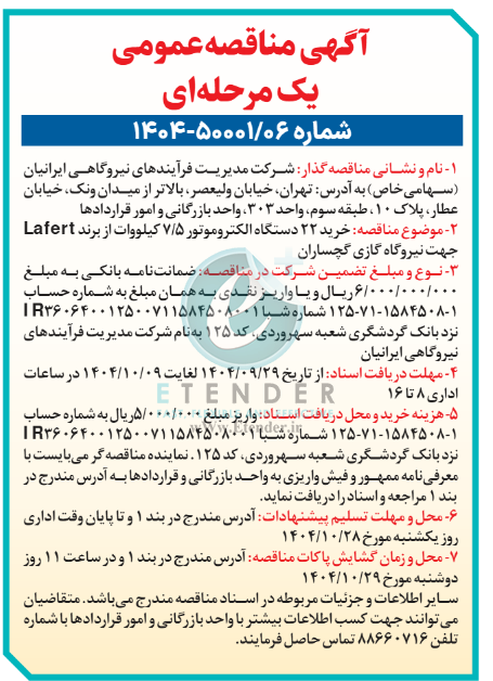 مناقصه خرید ۲۲ دستگاه الکتروموتور ۷/۵ کیلووات از بـرنـد Lafert جهت نیروگاه گازی گچساران