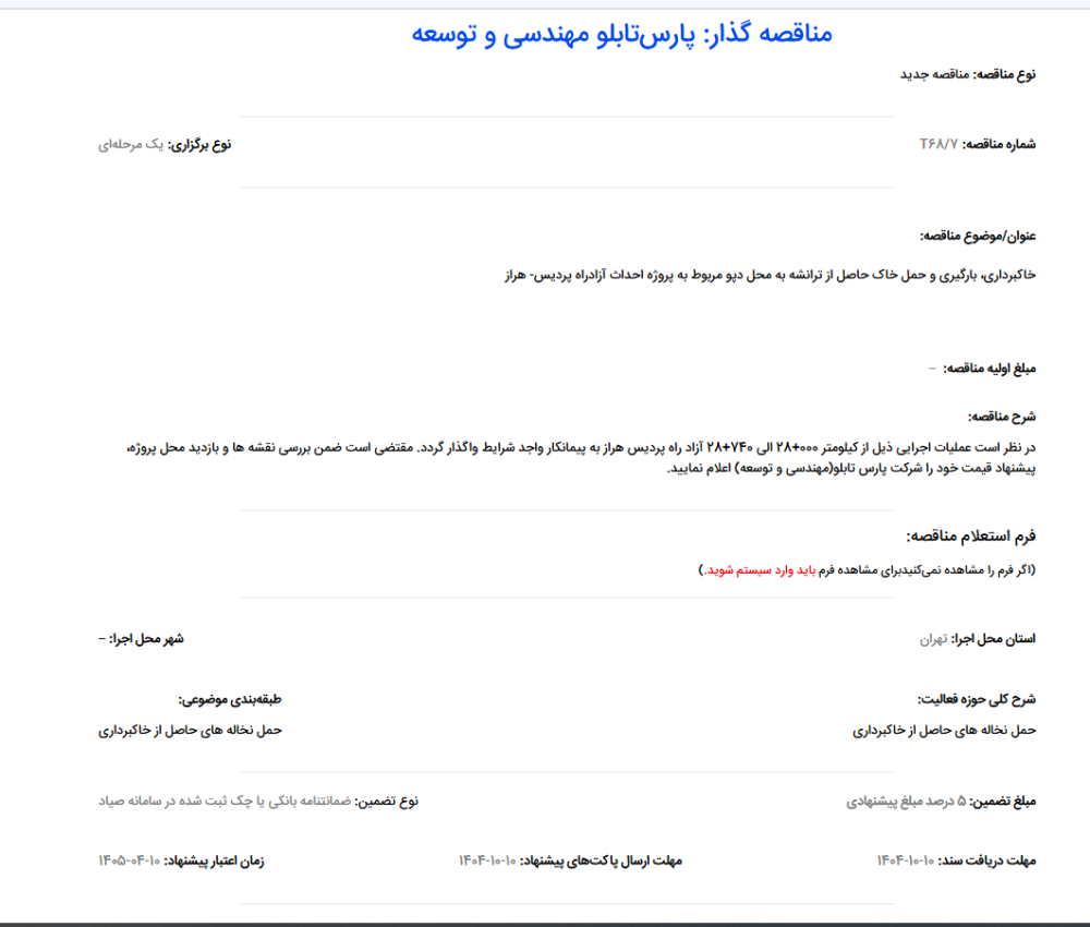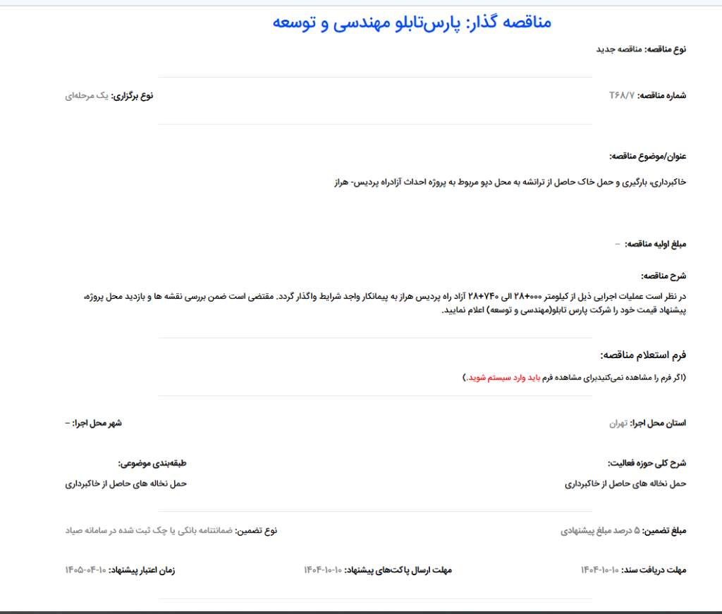 مناقصه خاکبرداری، بارگیری و حمل خاک حاصل از ترانشه شرکت پارس تابلو مهندسی و توسعه