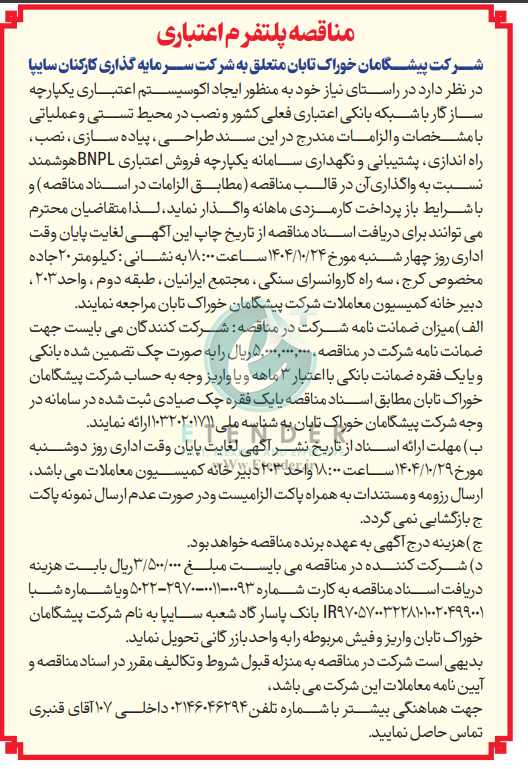 شرکت پیشگامان خوراک تابان متعلق به شرکت سرمایه گذاری کارکنان سایپا در نظر دارد در راستای نیاز خود به منظور ایجاد اکوسیستم اعتباری یکپارچه سازگار با شبکه بانکی اعتباری فعلی کشور و نصب در محیط تستی و عملیاتی با مشخصات و الزامات مندرج در این سند طراحی، پیاده سازی ، نصب ، راه اندازی پشتیبانی و نگهداری سامانه یکپارچه فروش اعتباری BNPL هوشمند نسبت به واگذاری آن در قالب مناقصه مطابق الزامات در اسناد مناقصه و با شرایط باز پرداخت کارمزدی ماهانه واگذار نماید.