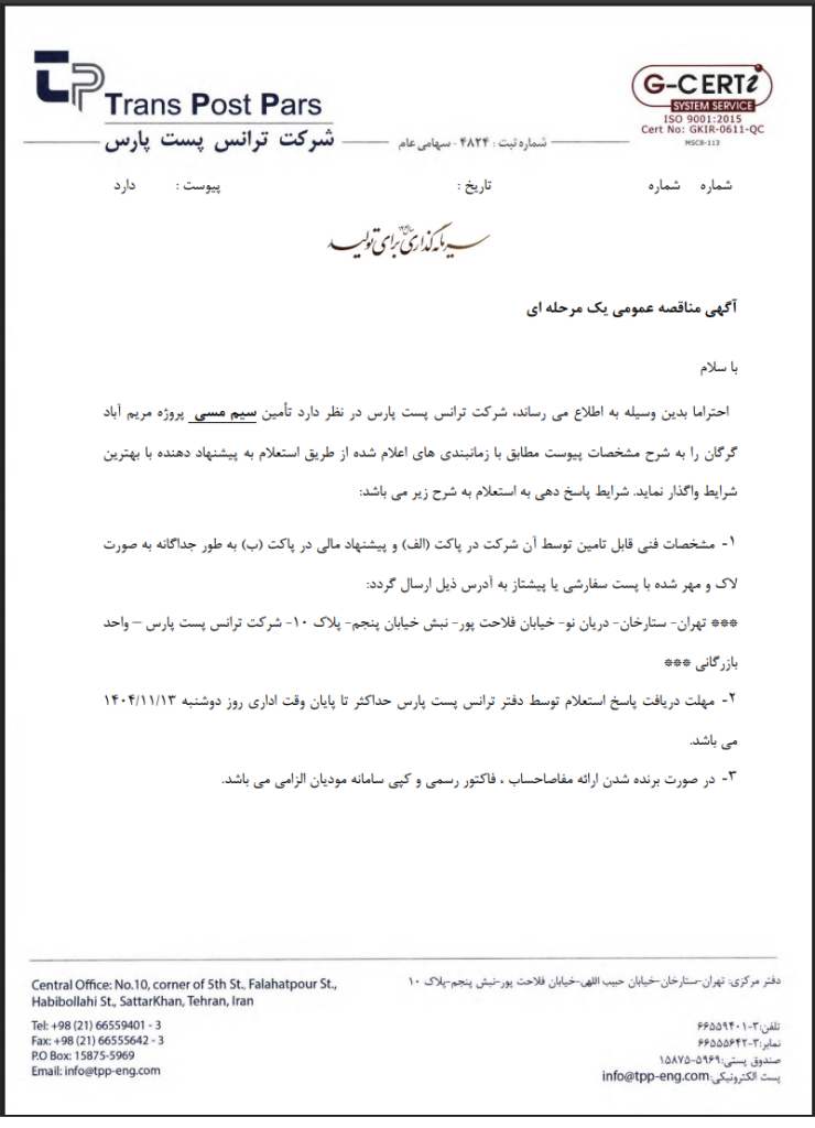 مناقصه تامین سیم مسی پروژه مریم آباد گرگان