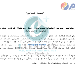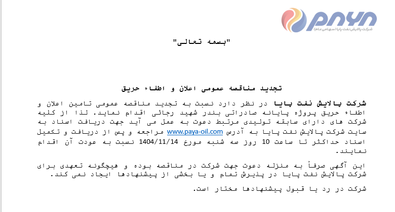شرکت پالایش نفت پایا در نظر دارد نسبت به تجدید مناقصه عمومی تامین اعلان و اطفاء حریق پروژه پایانه صادراتی بندر شهید رجائی اقدام نماید.