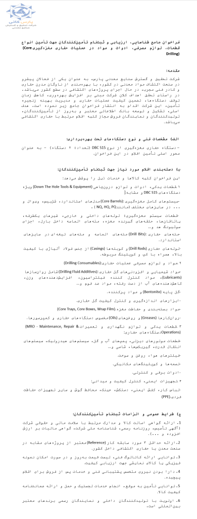 فراخوان جامع شناسایی، ارزیابی و ثبتنام تأمینکنندگان جهت تأمین انواع قطعات، لوازم مصرفی، ادوات و مواد در عملیات حفاری مغزهگیری شرکت پارس کانی (تحقیق و گسترش صنایع معدنی)