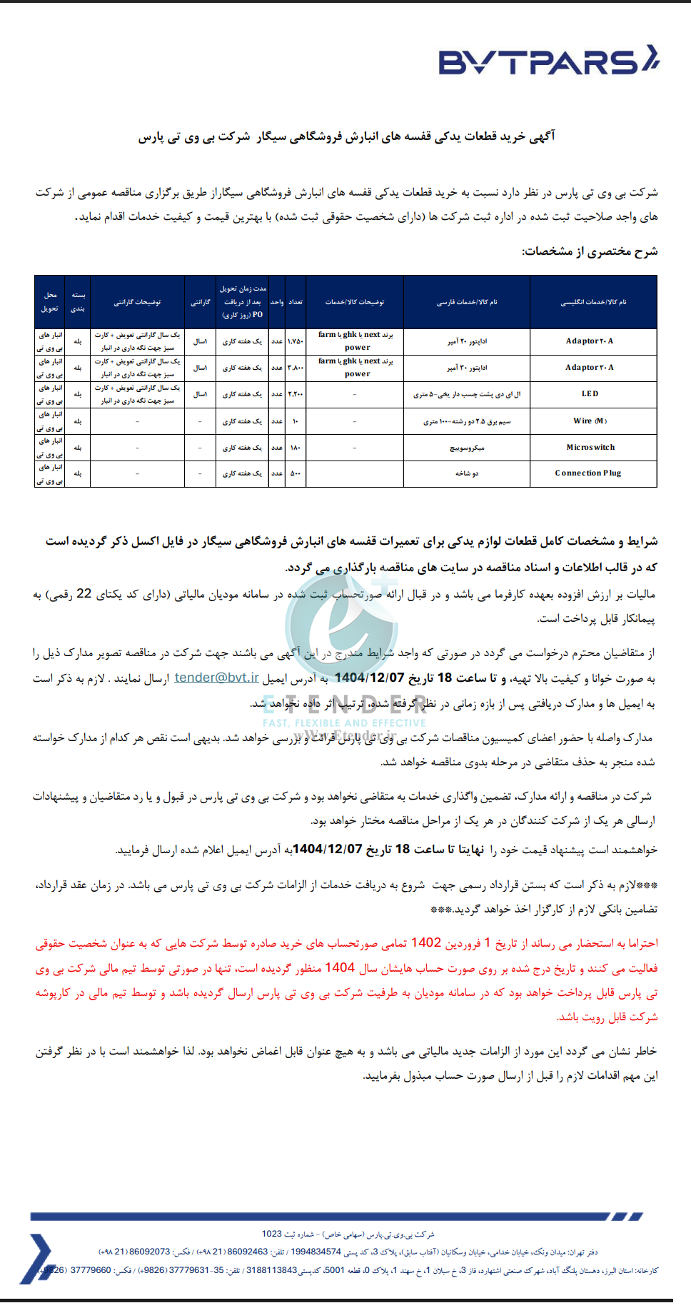 شرکت بی وی تی پارس در نظر دارد نسبت به خرید قطعات یدکی قفسه های انبارش فروشگاه ی سیگار از طریق برگزاری مناقصه عمومی اقدام نماید. ۱- A 20 Adaptor اداپتور ۲۰ آمپر ۲- Adaptor اداپتور ۳۰ آمپر ۳- ال ای دی پشت چسب دار یخی۵- متری led 4- سیم برق ۲٫۵ دو رشته۱۰۰- متری ۵- میکروسوییچ ۶- lug P tion onnec C دو شاخه