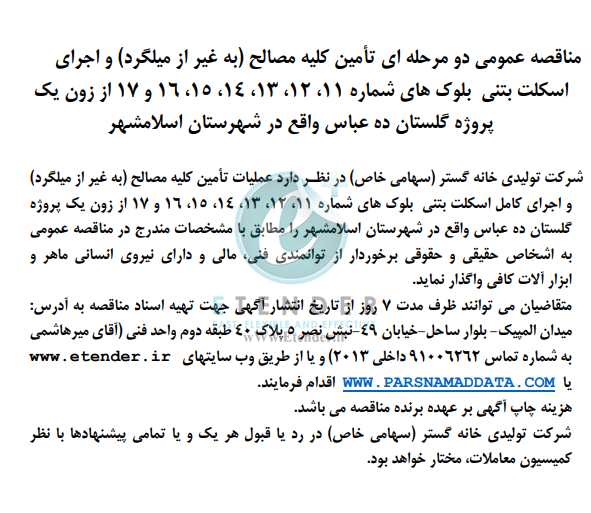 مناقصه عمومی دو مرحله ای تأمین کلیه مصالح (به غیر از میلگرد) و اجرای اسکلت بتنی بلوک های شماره ،۱۱ ،۱۲ ،۱۳ ،۱۴ ،۱۵ ۱۶ و ۱۷ از زون یک پروژه گلستان ده عباس واقع در شهرستان اسلامشهر