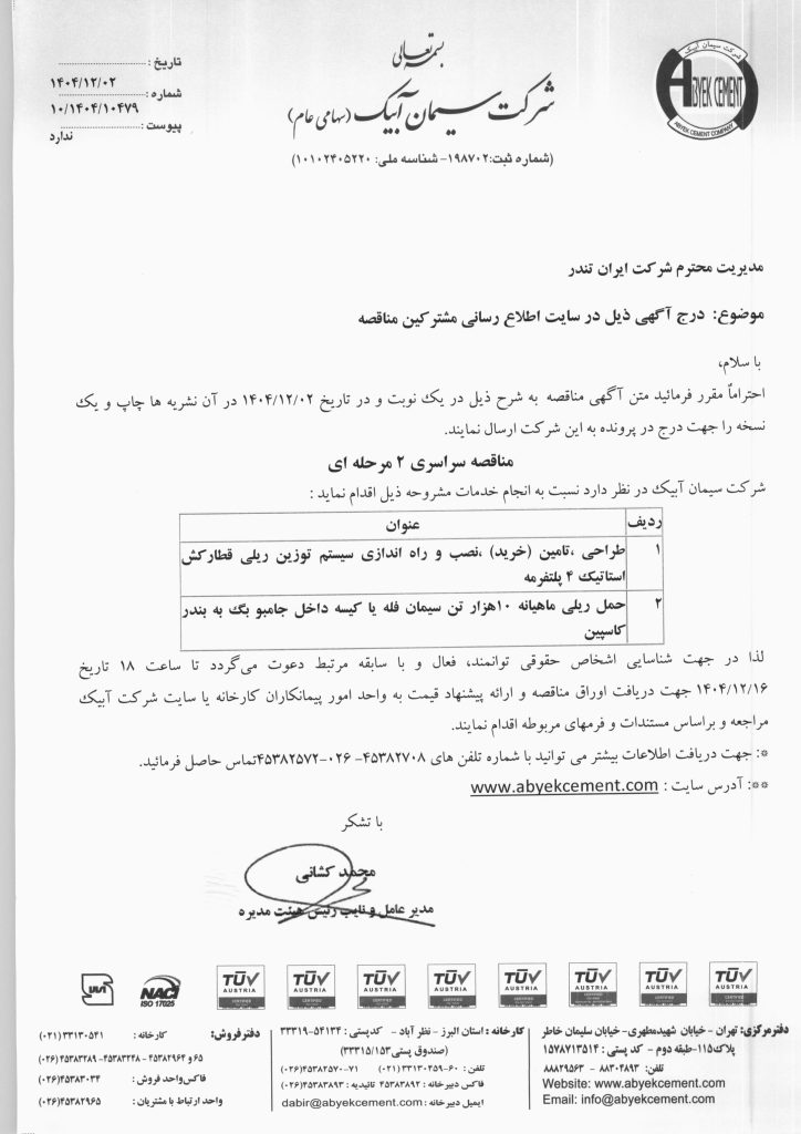 مناقصه گذار: سیمان آبیک