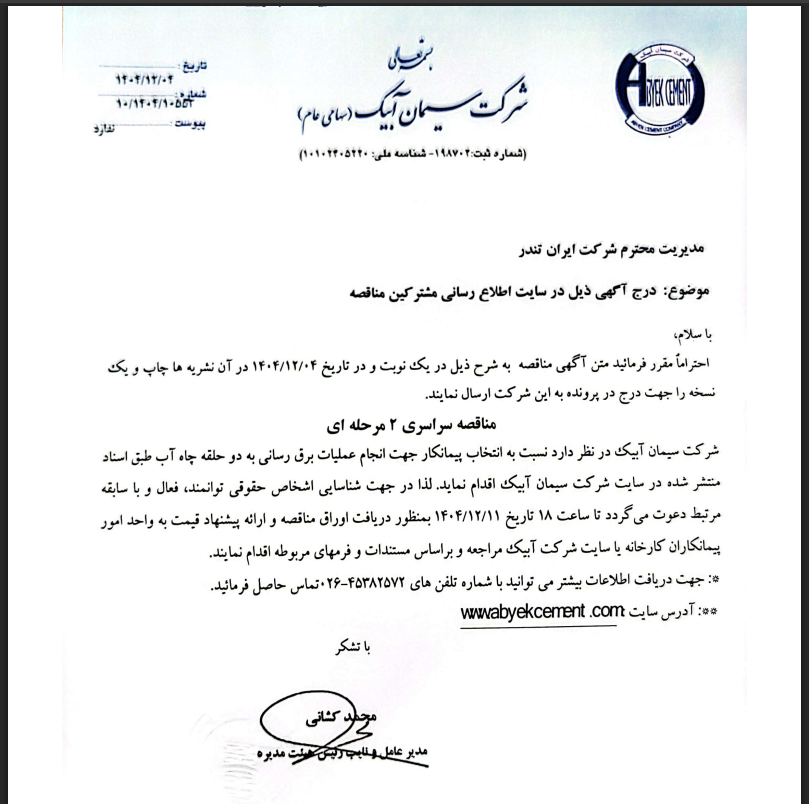 شرکت سیمان آبیک در نظر دارد نسبت به انتخاب پیمانکار جهت انجام عملیات برق رسانی به دو حلقه چاه آب طبق اسناد منتشر شده در سایت شرکت سیمان آبیک اقدام نماید